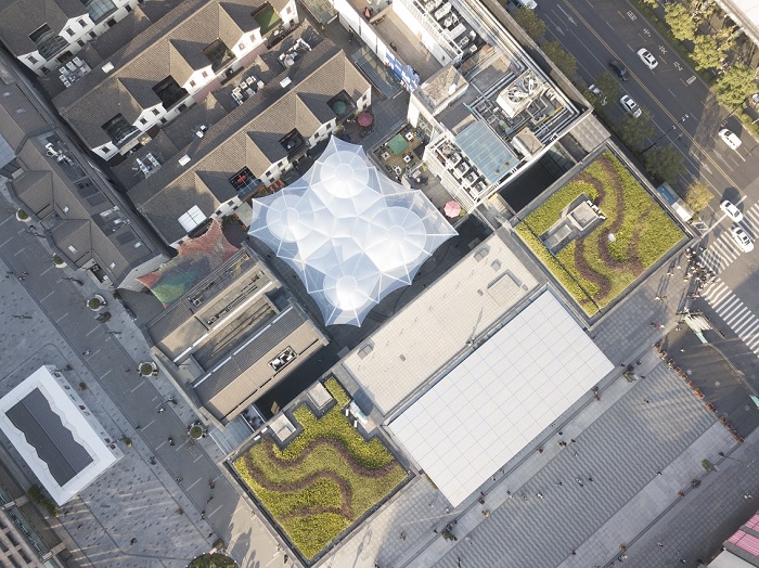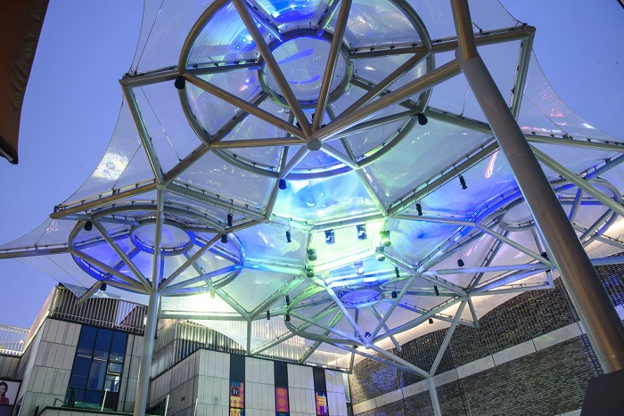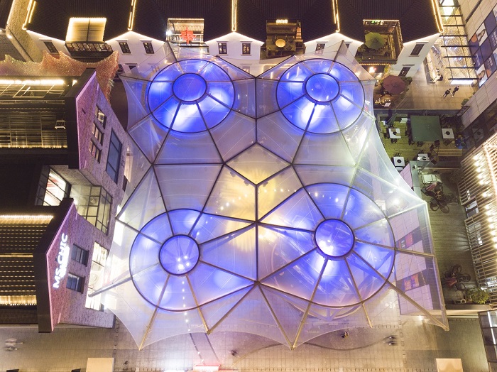 工程特點:該項目是國內(nèi)首個單層ETFE加雙層氣枕膜完美嵌合的景觀雨棚建筑,利用ETFE膜材的高透光高自潔性以及雙層氣枕的隔熱能力,雨棚在具有遮陽擋雨功能的同時還可以實現(xiàn)自然采光,行人沒有傳統(tǒng)密封建筑的束縛感;另一方面,ETFE膜結(jié)構(gòu)建筑是當(dāng)代最新的建筑應(yīng)用形式之一,工程高度定制,顏值高,具有唯一性,天生自帶聚集人氣光環(huán)。