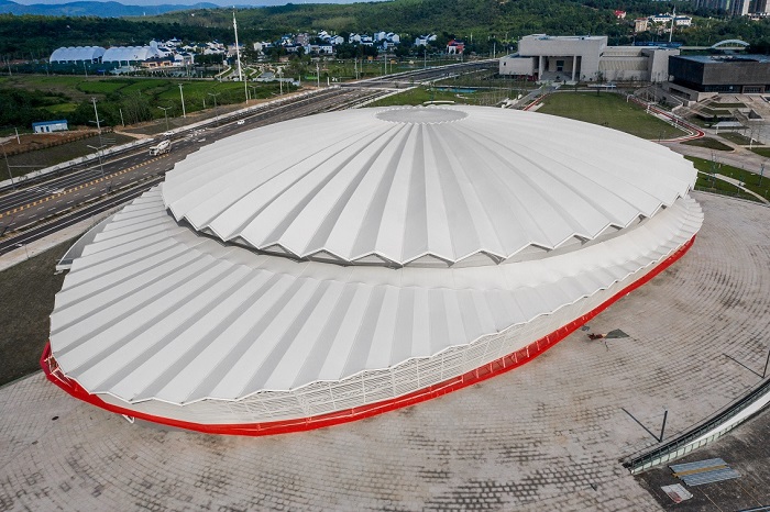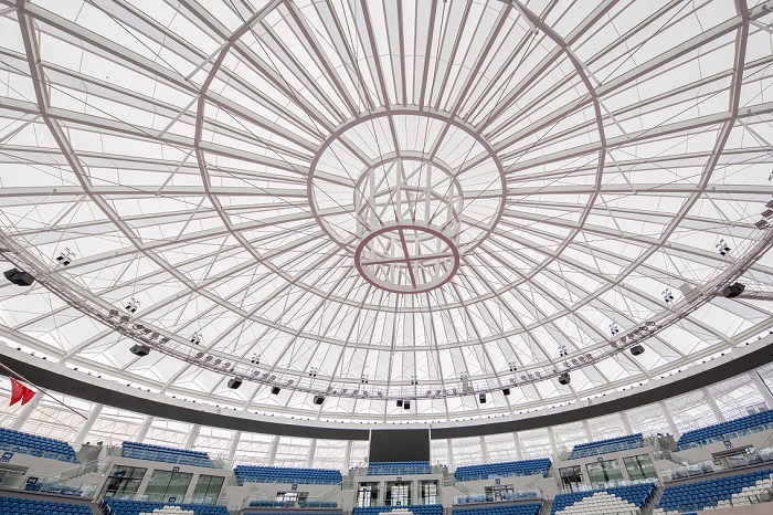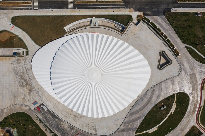 工程特點(diǎn):京山國際網(wǎng)球賽事中心膜結(jié)構(gòu)館,外形是兩個(gè)疊在一起的潔白扇貝殼,設(shè)計(jì)使用壽命在20年以上,能有效抵御9級(jí)以下地震。球館采用鋼結(jié)構(gòu)加PTFE膜的形式,內(nèi)部是寬敞的無立柱空間,各個(gè)座位的觀眾都能獲得良好的觀賽體驗(yàn);頂部的PTFE膜在將大部分紫外線紅外線隔絕之后,落在場館內(nèi)的是溫和的自然光,使場館內(nèi)白天時(shí)不開燈也光線明亮,比傳統(tǒng)的封閉建筑節(jié)能30%以上。