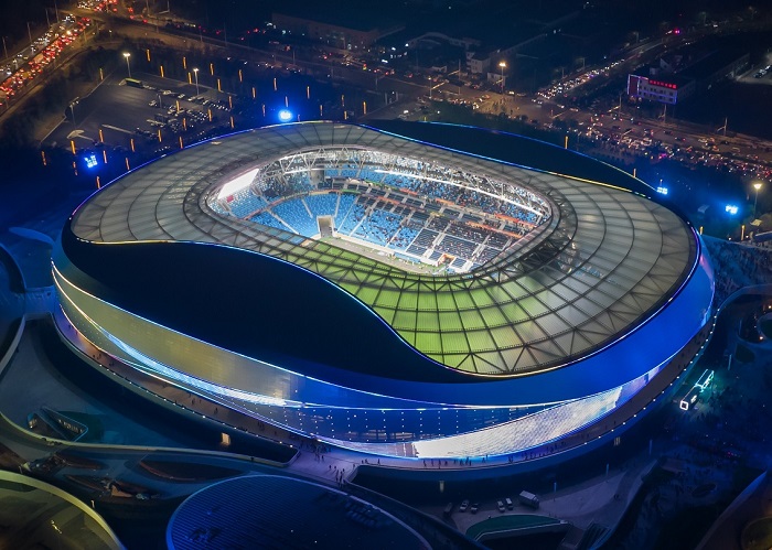 工程簡介:青島青春足球場是山東省首座五萬座專業(yè)足球場,滿足國際足聯(lián)國際A級比賽要求,是全國首個城站一體全民互動式公園化體育綜合體。青春足球場的設(shè)計靈感由海而來,取意“躍動海浪”。場館屋面外圈主體采用鋁鎂錳板勾勒塑造上下穿梭、飄逸流動的海浪造型,內(nèi)圈則用透明輕盈的ETFE膜結(jié)構(gòu)呼應(yīng)青島優(yōu)美的自然海岸風(fēng)光,彰顯了青島開放、現(xiàn)代、活力、時尚的城市氣質(zhì)。