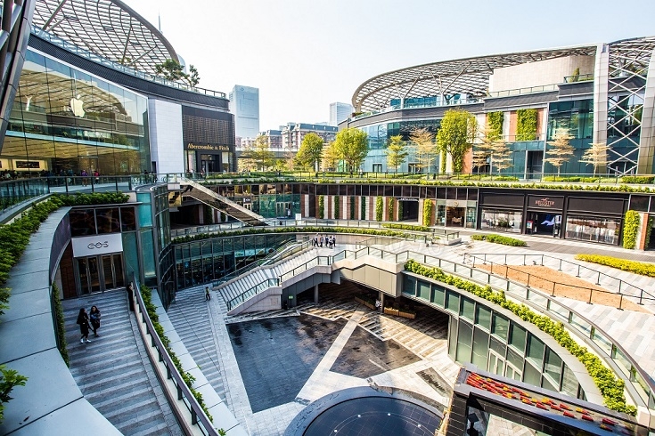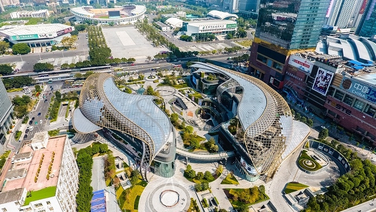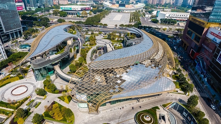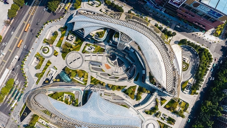 天環(huán)的建筑設計概念來自中國文化中象征著和平、和諧和財富的鯉魚,不銹鋼硬殼型結(jié)構屋頂酷似兩條游動的魚,透明的ETFE膜是魚鱗。