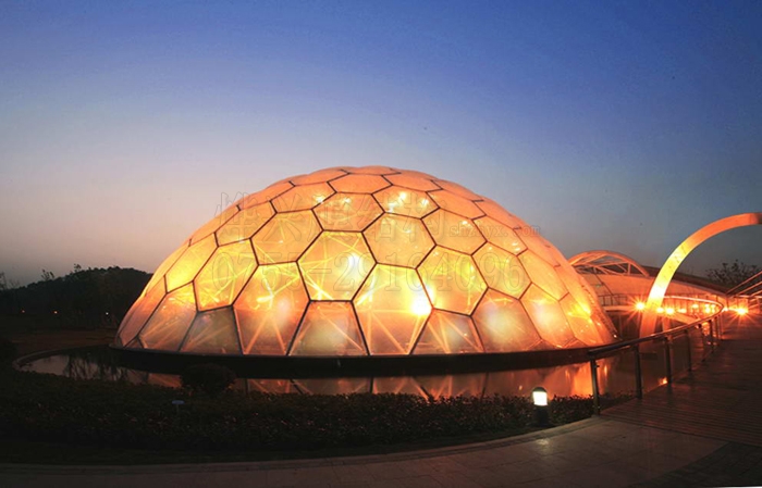 1、可以采用雙層膜結(jié)構(gòu),外層用ETFE膜材防雨雪防紫外線,內(nèi)層可以采用PTFE膜材達(dá)到保溫、防結(jié)露、隔音和光效的目的