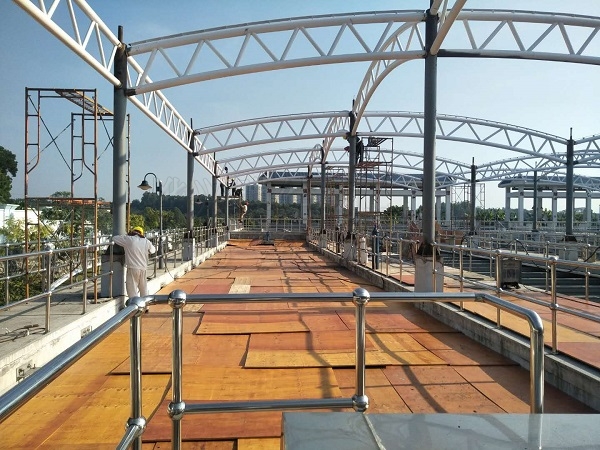 現(xiàn)場負責人告訴我,燁興龍華水廠膜結(jié)構(gòu)項目鋼構(gòu)加工目前已經(jīng)到達收尾階段,目前工人正在對鋼結(jié)構(gòu)進行補漆工作。我們上到水池高臺后,也注意到在最靠里的邊角,一群工人正在抓緊施工。水池上全鋪了防污染蓋板,現(xiàn)場負責人指著正在施工的那片區(qū)域說,那是鋼結(jié)構(gòu)最后的施工地點,也將是第一片膜材安裝地點。小編內(nèi)心猜測,你說得這么確定,是因為那里鋪滿防污染蓋板,正好不拆留著今后方便使用吧。
