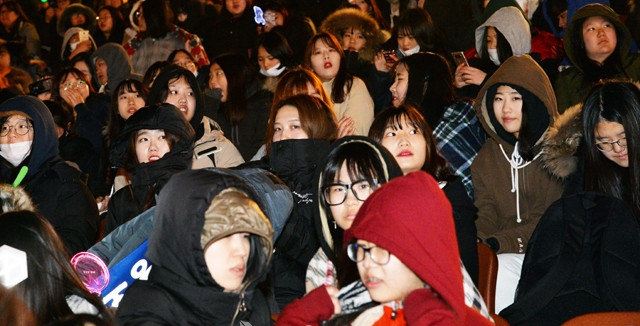 韓國平昌冬奧會開閉幕式露天場館韓流演唱會現(xiàn)場,觀眾為抗寒全副武裝