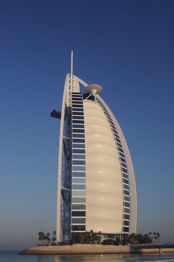 迪拜帆船酒店建在一個(gè)海濱人工島上,是一個(gè)帆船形的塔狀建筑,看起來(lái)就如一艘正在航行的大帆船,被譽(yù)為波斯灣的明珠。