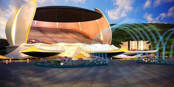 燁興云浮蓮花景觀型膜結(jié)構(gòu)舞臺是一個非常獨特巧妙的轉(zhuǎn)動式舞臺建筑,全部采用鋼模結(jié)構(gòu)制作。這個機械式舞臺造型取自在佛教寓意深遠的蓮花,為了營造與眾不同的觀賞效果,這朵巨型蓮花舞臺表演過程中會緩慢轉(zhuǎn)動,蓮花的花瓣也會隨著場景需要進行開合操作。可以想象一下,觀眾在一朵“活的”蓮花里欣賞節(jié)目表演,會得到怎樣的奇妙體驗。