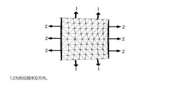 預(yù)應(yīng)力對(duì)于膜面施加次序:保證膜單元體在施加預(yù)應(yīng)力時(shí),先角部后中部;先短邊后長(zhǎng)邊依次進(jìn)行,并保持對(duì)稱(chēng)性張拉。