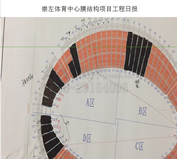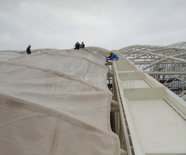 崇左市體育中心總用地面積約 783.45 畝,總建筑面積約122000平方米,其中主體育場涉及的膜結(jié)構(gòu)工程約有6萬平方米,目前已經(jīng)開始正式裝膜。在這樣一個巨大的建設(shè)工地中,每一個環(huán)節(jié)的推進都會涉及多個部門,需要相互配合好才能降低交叉作業(yè)的安全隱患。我們燁興非常有信心做好此次體量巨大的PTFE膜結(jié)構(gòu)工程,因為我們自己做過同類型項目,有豐富的大型項目施工管理經(jīng)驗。我們知道每一個階段該干什么、該怎么干好,以及怎么和其它兄弟部門進行聯(lián)動配合。