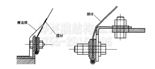 在膜結構建筑中膜材與邊索的連接,常用膜套、束帶、U形件等,根據(jù) 膜材、邊緣曲率、受力大小、預張力導入機制等決定。在實際工程中,主要采用下述三柔性膜邊界節(jié)點,并根據(jù) 具體構造而適當變化。
