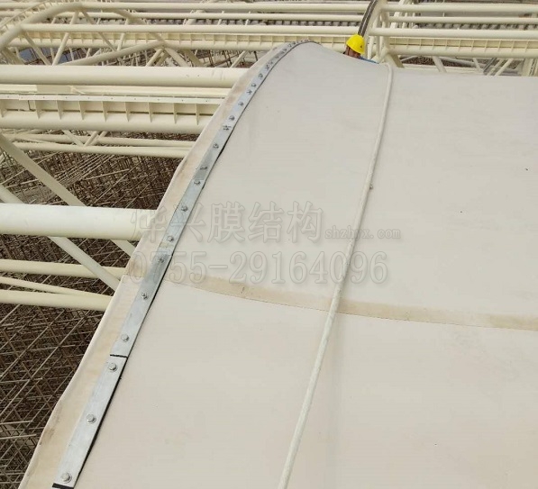 膜材與鋼索可以單邊或雙邊連接。簡(jiǎn)單的連接方法是將鋼索穿入熱合好的膜套中。對(duì)重要工程,可采用鋁合金或不銹鋼夾板和連接件來連接膜材與鋼索。
