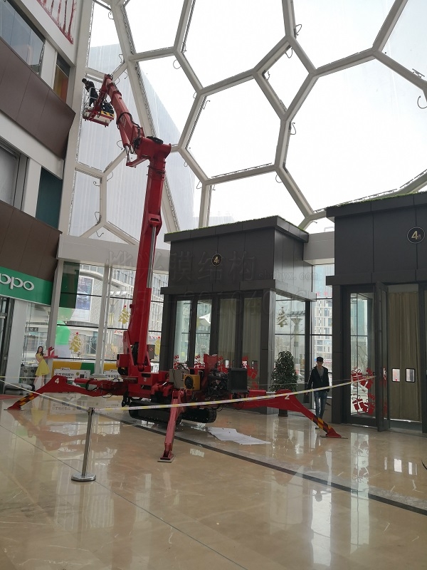 上圖為工人正在操作室內(nèi)工程起降設(shè)備對(duì)ETFE室內(nèi)里面進(jìn)行清潔保養(yǎng)