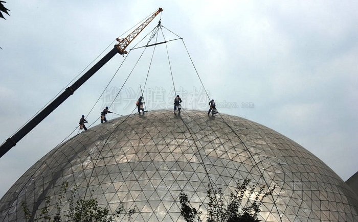 近日,數(shù)名“蜘蛛人”對中國科技館球幕影院的球面外墻進(jìn)行高空清潔作業(yè)。作為資深膜結(jié)構(gòu)行業(yè)從業(yè)者,看到這則報道的第一想法是——假如這個球面外墻是用我們的ETFE膜結(jié)構(gòu)進(jìn)展制作,是否這些清潔作業(yè)就不需要了呢?要回答這個問題,我們先來先弄清楚玻璃屋面與ETEF膜結(jié)構(gòu)屋面的區(qū)別,一起來看一下吧。