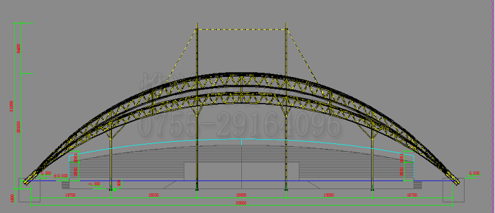吉安體育場(chǎng)鋼膜結(jié)構(gòu)工程最大建筑高度為 31 m,長(zhǎng)89米(示意圖如下所示),建筑層數(shù)為1層,結(jié)構(gòu)形式采用鋼膜結(jié)構(gòu),工程面積1858平方米,基礎(chǔ)形式為鋼筋混凝土基礎(chǔ),兩者采取同心異徑管連接方式,抗震設(shè)防烈度6 級(jí)。