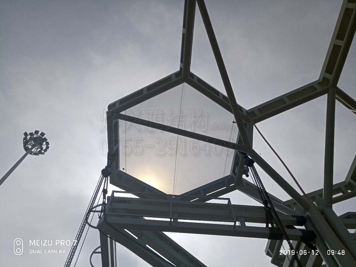 從上圖中我們可以看到,新裝的ETEF氣枕單元成型完美,外觀飽滿無(wú)褶皺,從地面往上看通透晶瑩,水泡感滿溢。另外,整個(gè)單元與底座高度契合,六角形的六個(gè)邊線鋁壓板與外圍邊框間隙邊線都相互平行。這些細(xì)節(jié)傳遞出了許多信息,一是我們的鋼結(jié)構(gòu)加工符合工藝標(biāo)準(zhǔn),二是我們現(xiàn)場(chǎng)的測(cè)量人員數(shù)據(jù)收集準(zhǔn)確,三是ETFE膜裁剪加工沒(méi)有問(wèn)題,只有全部參數(shù)都符合標(biāo)準(zhǔn),才能做出這樣完美的ETFE氣枕。