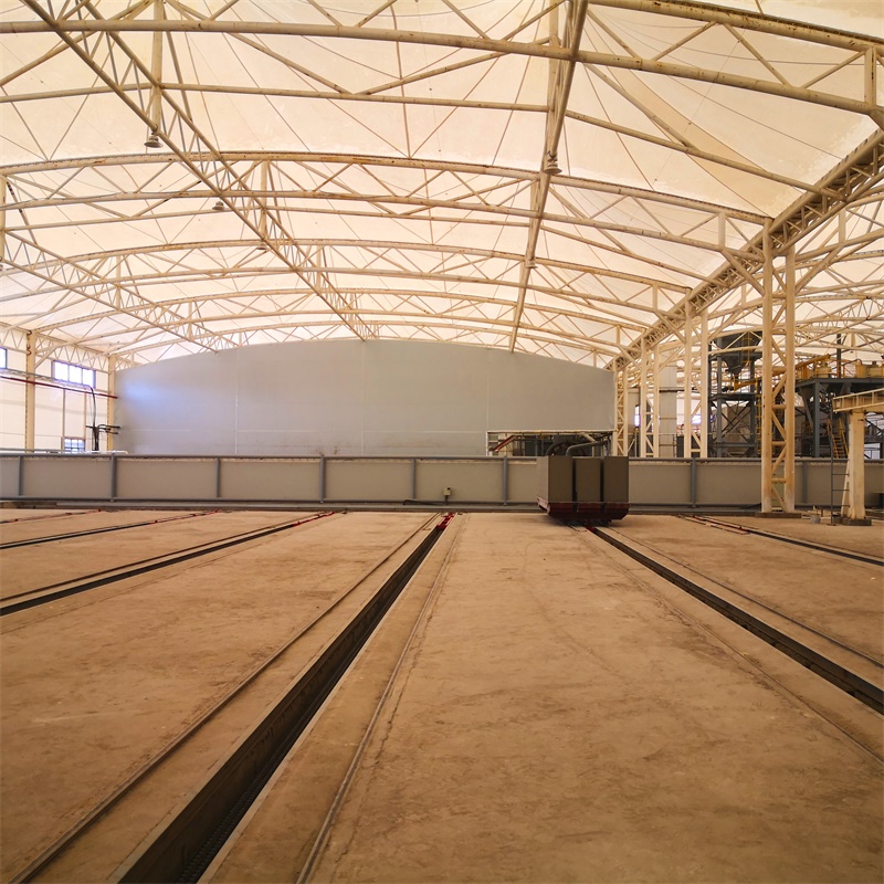 工程特點:為契合當(dāng)?shù)氐拿褡屣L(fēng)情及地域氣候特征,在與客戶充分溝通后,烏茲別克斯坦阿漢加蘭磚廠屋面被設(shè)計為排列的大圓錐冒頂形式,這些能引起視覺震撼效果的建筑設(shè)計既是磚廠的天然招牌,又能將風(fēng)沙雨雪對屋面的影響降至最低。除了屋面采用膜結(jié)構(gòu)形式,廠房的外立面(1.6米以上)也采用膜結(jié)構(gòu)進(jìn)行封閉圍護(hù),這樣極大縮短了項目的施工周期,白天時廠房內(nèi)無需使用任何電器照明即可達(dá)到理想的采光效果。