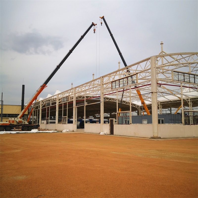 工程概況:烏茲別克斯坦阿漢加蘭磚廠膜結(jié)構(gòu)項目,是典型的屋面及外墻立面都采用鋼膜結(jié)構(gòu)的大型廠房工程,總用膜量48800平方米,由深圳市燁興膜結(jié)構(gòu)工程有限公司提供一站式解決服務(wù)。